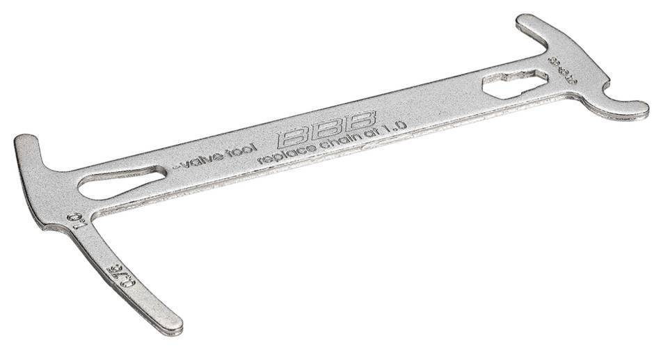 Benutzerfreundliche Kettenverschleißlehre. Wenn die Längung 0,75 = 75% erreicht, sollte die Kette bald ausgewechselt werden. Erreicht die Längung 1,0 = 100%, dann muss die Kette sorfort ausgewechselt werden. Der integrierte Kettenhaken hält die Glieder bei der Montage. Ein einzigartiges Multifunktionswerkzeug mit zusätzlichem Ventilwerkzeug und 5/6/8mm Schraubenschlüssel.